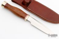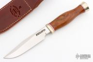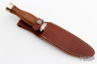 This Model 5-5 by Randall Made Knives features a satin finished blade with false top edge and notched thumbrest, .213" blade stock and 1.057" blade depth, hidden tang construction. The handle has a nickel silver guard and butt, African Ironwood grip with red/duralumin spacers. Comes with a brown leather sheath. Has some light scratches, otherwise excellent condition.