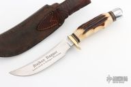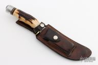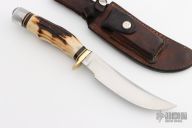 This Alaskan Trapper by Coast Cutlery Co was hand made in Solingen, German. It features a satin finished blade with notched thumbrest and false top edge, .248" blade stock and 1.045" blade depth, hidden tang construction. The handle has a brass guard, stag grip with black/white spacers, aluminum butt. Comes with original brown leather sheath. Has a few light scratches, otherwise excellent condition for your age.