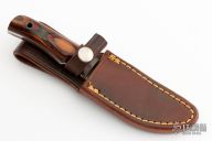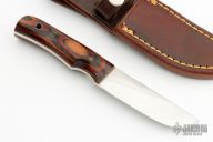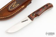 This Model 10-3 by Randall Made Knives features a satin finished blade with notched thumbrest, .114" blade stock and .846" blade depth, full tang construction. The handle has pakkawood scales with brass pins. Comes with a brown leather sheath. Has a couple light scratches, otherwise excellent condition. Comes with a Randall zippered case.