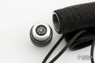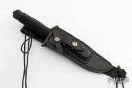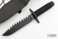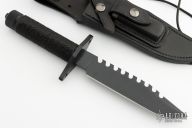 This MCE II Survival Knife by Ed Martin features a black cerakoted blade with sharpened top edge and sawteeth along the spine, .266 blade stock and 1.389" blade depth, hollow handle contruction. The handle is comprised of a cerakoted double guard with cord wrapped handle over hollow tang construction with a threaded removable butt cap with compass. Includes a black leather sheath with belt loop and zippered case. Excellent condition. Dated '11 under the ricasso