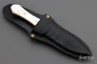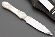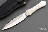This dagger features a double edged mirror polished blade with .141" blade stock and .979" blade depth, full tang construction. The handle has mother or pearl scales with nickel silver pins. Comes with a black leather sheath, not original but fits nicely. Excellent condition. The consigner said that this was made by Lamont Coombs Jr, but it is not marked, and I'm not sure of that.