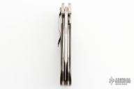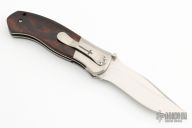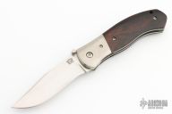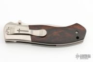 This linerlock folder by DB Fraley features a hand rub satin finished blade with a notched thumb ramp and dual thumb studs.  The handle features satin finished titanium bolsters and liners, desert ironwood burl scales, brown canvas micarta backspacer, and a tip down titanium clip. "JDIX3" on the front bolster. Has some light scratches, otherwise excellent condition. Comes with a zippered case.
