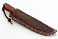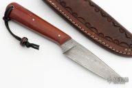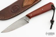 This knife by Kyle Hanson features a Damascus drop point blade with false top edge and a tapered tang construction, .144" Blade Stock.  1.059" Blade Depth.  The handle has paper micarta scales over red liners.  Includes a hand tooled brown leather sheath by Kenny Rowe's Leather. Light patina/oxidation is visible on the blade otherwise the knife is in good condition.