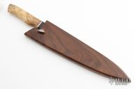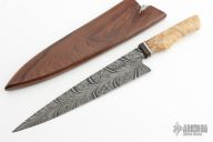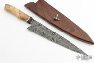 This Chef Knife by Abril Knives features a Feather Damascus blade with .167" blade stock and 1.953" blade depth, hidden tang construction. The handle has a wood guard, stainless spacer, and buckeye burl grip. Comes with ironwood saya with feather pin. Excellent work. New from maker!