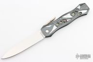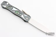 This leverlock folder by Dave Longworth features a mirror polished drop point blade. The handle has a carved blued steel frame with mother of pearl and abalone underlays, stainless steel backspacer and a nickel silver lever release. Excellent condition. This knife won "Best Handmade Folder" in 1984 at a knife show. Comes with a zippered case.