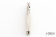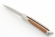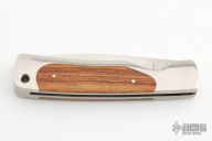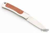 This linerlock by Michael Walker features a hand rub satin finished blade. The handle has a stainless steel frame with wood inlays, stainless steel liners. Nice lockup and blade seating. Has some light scratches, otherwise excellent condition. Blade marked "MLW 001" Comes with a zippered case. Made in 1982