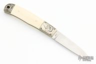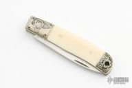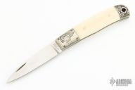 This slipjoint by Jess Horn features a hand-rubbed satin finish blade with nail nick. The handle has engraved nickel silver bolsters and cap, nickel silver liners, mammoth ivory covers and a stainless steel spring. Nice blade seating. Opens and closes with a nice snap. #029 on blade. Comes with leather zippered case. Has a couple light scratches, otherwise excellent condition.