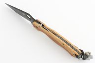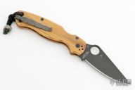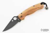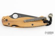 This Paramilitary 2 by Spyderco has a black clip point blade with thumbhole and notched thumb rest. Handle has custom hickory scales with stainless steel liners and a titanium pocket clip.  Titanium backspacer.   Includes a padded velcro case.  Excellent Condition.