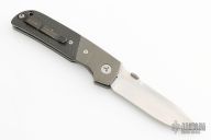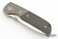 This Terzuola D/A side opening automatic by Marfione Custom Knives features a hand-ground, satin finished blade, bead blasted titanium bolsters, and carbon fiber scales, stainless liners, black coated titanium clip. Leaf spring bolster release. Dated 11/2003 and S/N 0541. Hard to find. Comes with a zippered case. Has scuffs and scratches throughout, good user condition otherwise.