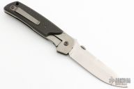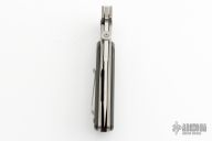 This ATCF from Bob Terzuola features a tumble polish finished drop point blade with swedge, thumbdisc and notched thumbramp. The handle has black g10 scales, titanium frame and liner, black linen micarta backspacer. Has scuffs and scratches, good user condition.