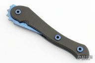 This Pocket Axe framelock folder by Warren Thomas features a chisel ground finger print anodized titanium blade with a carbide edge. The handle has carbon fiber scales, a finger print anodized titanium liner, G-10 backspacer.  In the open and locked position, the blade is perpendicular to the handle, like a hatchet or tomahawk.  Nice lockup, detent and blade seating. Excellent condition. Comes with a zippered case.