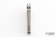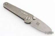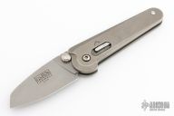 This unique design from Joe Caswell features a tumble finished blade with notched thumbrest and dual thumbstuds. The handle is tumble finished titanium, "15P 015" on back of frame. Has retracting clip when open. Locks via the release bar in the center of the handle. Has nice lockup and blade seating. Comes in padded velcro case. Has a couple light scuffs and scratches, otherwise excellent condition.