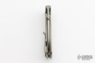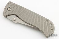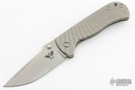 This Talos by Les George and Wilson Combat features a stonewashed blade with a false top edge, notched thumbrest and reversible dual thumbstud. The handle has a stonewashed titanium with matching tip up clip. Nice detent, lockup and blade seating. Very smooth action. Comes with zipper case. Excellent condition.