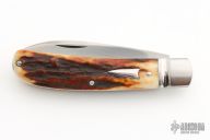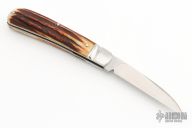 This slipjoint by David Taber features a hand rub satin finished blade with nail nick. The handle has a fluted stainless steel bolsters, stag covers, stainless steel liners, escutcheon and spring. Half stop on blade, flush in all positions. Comes with a leather slip sheath and COA dated March 2023. New from maker at the 2023 Blade Show.