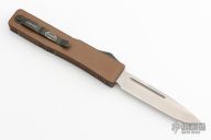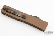 This Early Ultratech by Microtech Knives features a tumbled drop point blade with swedge and fullers. The handle is comprised of brown anodized aluminum with ramped steel thumb slide and tip down clip. S/N of 3254 and dated 09/2003. Comes with T365 zipper case. Has some scuffs and scratches but overall good user condition.