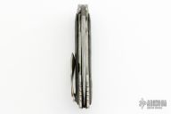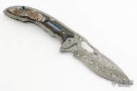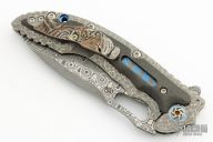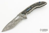 The Avenger by Flavio Ikoma features a Damascus blade with notched thumbrest and flipper, and a thumbhole. the handle has a textured titanium frame, lightning strike carbon fiber overlays with super conductor underlays, super conductor backspacer with carbon fiber liners, tip up carved titanium clip. Interior of frame is jeweled. Rides on IKBS, nice detent, lockup and blade seating. Excellent condition. Comes with a velcro case.