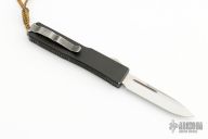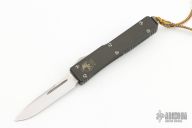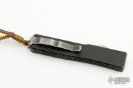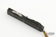 This UTX-70 OTF automatic features a stonewash finish blade with fullers, swedge, and a standard edge. Has a black aluminum frame, dated 05/2004 and S/N 0441. Has scuffs and scratches throughout, broken tip, fair condition.