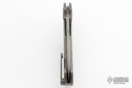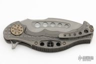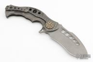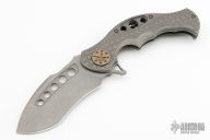 This Battle Master Flipper (BMF) by Curtiss Knives features a blasted Magnacut compound ground recurve blade with notched thumbrest and flipper. The handle has a stonewashed Frag Mill titanium frame with matching backspacer and tip up clip. Bronzed titanium hardware. Rides on bearings with the spot pivot system. Nice detent, lockup and blade seating. Comes with original box, COA dated 4-2-23 and zippered case. New from maker.
