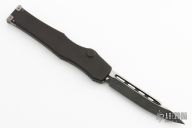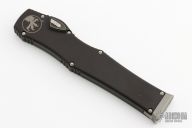This Halo VI by Microtech knives features a black drop point blade with fullers and satin flats. The handle has a black aluminum frame with blasted stainless steel hardware and charging handle. Dated 07/2018 and #1628. Comes with Original box and papers. Has a couple of small white dots on the frame, otherwise excellent condition.