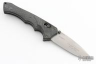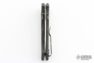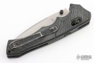 This 615 Mini-Rukus is a Neil Blackwood design executed by Benchmade. It features a drop point blade with swedge, dual thumb studs and notched thumbrest. The handle has black G10 scales over black coated steel liners and barrel spacers. The black coated deep carry clip is reversible for left or right hand, tip up carry. Includes original drawstring pouch, paperwork and box. Shows signs of use otherwise the knife is in good condition. This knife would make good user.