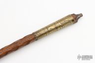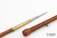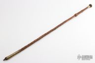 This antique cane features a hidden spike, unscrew the handle from the cane to reveal. The cane is made from wood and is carved, has a brass ferrule at the end with a carbon steel finial. Has a buffalo horn ball withe brass collar and wrapped leather grip. Has some patina and scratches, but overall good condition for its age.  This one was made in 1925