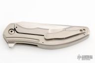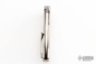 This Piston by Gerry McGinnis features a hand rub satin finished recurve blade with notched thumbrest and flipper. The handle has a checkered titanium frame with orange peel finished backspacer, matching clip. Nice detent, lockup and blade seating. Dated 3-31-19 the frame and is #025. Comes with zippered case. Excellent condition.