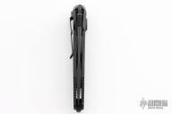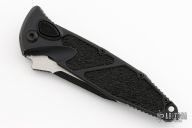 This Socom Elite Auto from Microtech has two toned drop point blade with notched thumbrest. The handle has a black aluminum frame with non-slip rubber inserts and a tip down stainless steel clip, black hardware. Dated 11/2020 and S/N 6449. Includes original box and paperwork. Has scuffs and scratches, has been resharpened. Good user condition.
