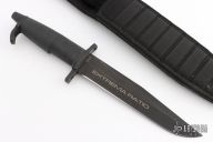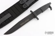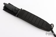 This knife features a black clip point blade with a hidden tang construction. .245" Blade Stock. 1.458" Blade Depth. The handle has a black steel guard and butt cap with a rubber grip. Includes a black nylon sheath. Excellent Condition.