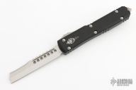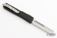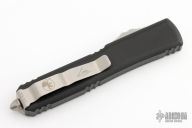 This Ultratech by Microtech Knives features a stonewashed Hellhound Razor blade with satin flats and false top edge. The handle has a black aluminum frame with tip down blasted stainless steel clip and hardware. Comes with original box and papers. 12/2022, S/N 838. Excellent condition.