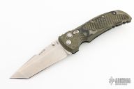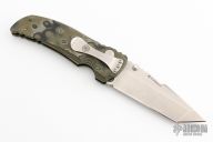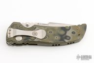 This Hogue/Elishewitz design features a stonewashed blade with dual thumbstuds and notched thumbrest. The handle has milled G-Mascus G10 frame with button lock, safety and tip down carry clip. Includes original box and papers. Excellent condition.