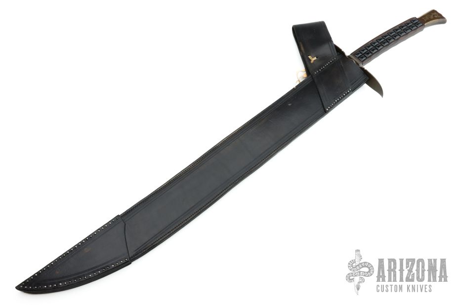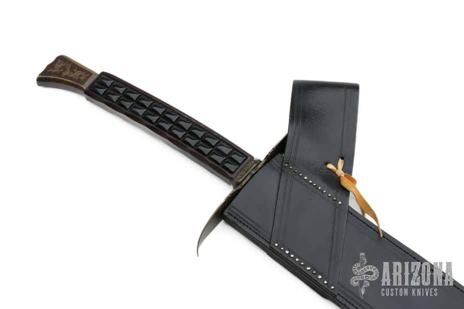 This Avatar Series Katana by Daniel Watson of Angel Sword features a Techno-Wootz Damascus blade, double fullers with etching, fileworked blade spine, .176" blade stock and 1.795" blade depth, hidden tang construction. The handle has a brass/bronze guard, carved wood grip with square black stone/onyx/horn? inlays on both sides, brass/bronze butt. Guard and butt have engraving. Comes with a black leather sheath. Beautiful sword. Has some light oxidation in a couple spots on the blade, otherwise excellent condition.