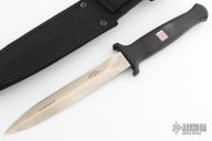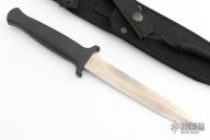 This Guardian II by Gerber features a double-edged satin finished blade, .243" blade stock and .939" blade depth, hidden tang construction. The handle is black coated cast aluminum. Comes with a black nylon sheath, original box and papers. Excellent condition.