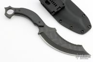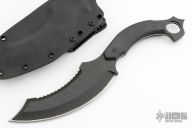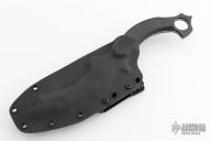 The Krudo Knives RAW Hybrid is 11-3/4" overall with a 6-1/4" 154CM stainless blade with black weave carbon fiber finish. The sawback serrated portion of the knife as well as the tip at the end of the serrations are extremely sharp. The blade is full tang and surrounded by slabs of woven carbon fiber for an awesome looking design. The handles are made from black G10 and the oversized ring pommel with striker ensures a rock solid grip. Comes with a black molded Kydex sheath with Tek-Lok attached. Made in the USA. Excellent Condition.