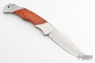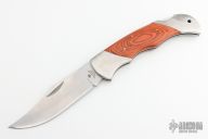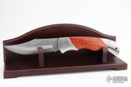 This large lockback folder by "Wild Turkey Handmade Collection" features a satin finished blade with nail nick. 3CR13 Steel Blade. The handle has stainless steel bolsters and liners, dymond wood scales, stainless steel lockback and backspacer. Comes with a wooden display stand. Excellent condition.