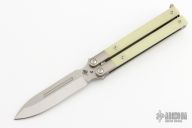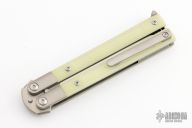 The SPD Invictus-Bali GID is a utility style, bi-handle folding knife, featuring titanium billet handles with integrated bolsters and Hyper-Glow GID scales with 3 fullers each, a Böhler M390 blade, new, updated bearing pivot, and a titanium spring latch. Additional details include 2-tone machine satin and bead blast blade finish, jimping on the ears and back spacers, and a billet titanium pocket clip. Specifications: