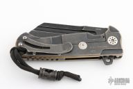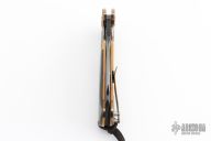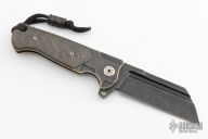 This ADV Butcher framelock flipper by Andre De Villiers has a black stonewashed blade with a notched flipper tab.  The handle is composed of black tumbled titanium with a matching tip up pocket clip/backspacer and a single carbon fiber scale.  Includes a padded zippered case.  Number 9 of 14 left-handed knifes ever made by Andre.. Includes a Joseph Smith carbon fiber MOA bead.  Light blade play.  Light scuffs are visible on the frame otherwise the knife is in excellent condition.