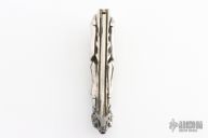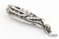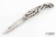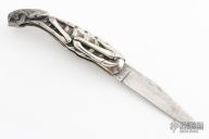 This slipjoint by Jean-Marc Laroche features a Damascus blade with nail nick. The frame of the knife is the body of an alien creature. The frame is silver plated bronze. The liners are brass. This is a very unique and beautiful knife. Dated 1998. Has some light patina, otherwise excellent condition.