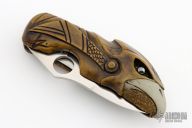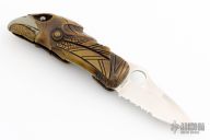 This Walker Lightweight by Spyderco features a satin finished partially serrated blade with thumbhole and notched finger rest. The handle has been custom made by Jean-Marc Laroche. Not sure what the handle material is. Dated 2001. Excellent condition.