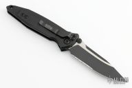 This Socom Elite from Microtech has a black/satin partially serrated blade with dual thumbstuds and notched thumbrest. The handle has a black aluminum frame with non-slip rubber inserts and a tip down stainless steel clip, black hardware. Dated 08/2022 and S/N 10550. Includes original box and paperwork. Excellent condition.
