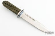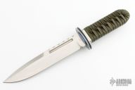 This knife by Shane Sibert features a satin finished spear point blade with sharpened top edge, fileworked thumbrest and fullers, .248" blade stock and 1.438" blade depth, hidden tang construction. The handle has a stainless steel guard with green over tan cord wrap. Comes with a zippered case. Excellent condition.