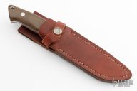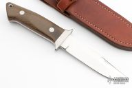This Loveless Style Chute Knife by David Sharp features a mirror finished blade with a 2" sharpened top edge, .212" blade stock and 1.055" blade depth, full tapered tang construction. The handle has a satin finished stainless steel guard, brown canvas micarta scales with red liners. Comes with a brown leather sheath. Excellent condition.