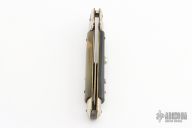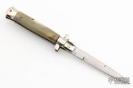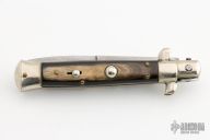 This picklock automatic by RJ Richter features a bayonet ground blade with false top edge. The handle has nickel silver bolsters, buffalo horn scales,  brass liners, steel backspacer. Has safety. Has scratches and patina, otherwise good condition.