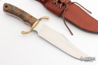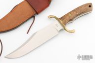 This bowie by Boker features a satin finished blade with false top edge, .255" blade stock and 1.774" blade depth, full tang construction. The handle has a brass guard, walnut scales with brass pins and lanyard hole. Comes with original brown leather sheath. Has a little patina on the brass, otherwise excellent condition.