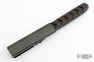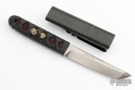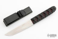 This Kozuka by RJ Martin features a chisel ground tanto blade with swedge, .133" blade stock and .745" blade depth, full hidden tang construction. Handle is cord wrapped over black stingray skin. Comes with a carbon fiber scabbard, Rare Earth Magnet in sheath assures a solid fit for blade. Excellent condition for an older knife by Randy.