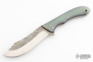 This knife by Grange Park Knifeworks features a satin grind and textured flats, .149" blade depth and 1.408" blade depth, full tang construction. Handle has translucent G-10 scales with blue G-10 and natural canvas micarta liners and mosaic pins. Excellent condition.