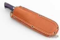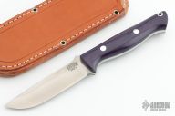 This Gunny by Bark River Knives features a satin finished blade with notched thumbrest, .153" blade and .939" blade depth, full tang construction. The handle has Purple G-10 scales with gray G-10 liners and aluminum pins. Comes with a brown leather sheath and original box. Excellent condition.