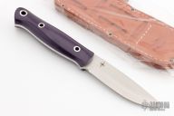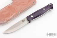 This fixed blade from Bark River Knives features a satin finish drop point blade with a scandi grind, .164" blade stock and 1.014" blade depth. The handle has purple G-10 scales with red liners and hollow pins over full tang construction. Lanyard hole on pommel. Includes leather sheath and original box. Excellent condition.