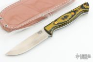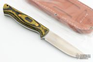 This Gunny by Bark River Knives features a satin finished blade with scandi grind, .143" blade and .951" blade depth, full tang construction. The handle has yellowjacket burlap micarta scales brass pins. Comes with a brown leather sheath and original box. Excellent condition.