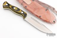 This Cub by Bark River Knives features a satin finished blade with a notched thumbrest and fullers, .190" blade and 1.185" blade depth, full tang construction. The handle has yellowjacket burlap micarta scales with green liners and aluminum pins. Comes with a brown leather sheath and original box. Excellent condition.