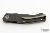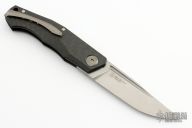 This Pero Flipper by Shirogorov and Dmitry Sinkevich features a matte finished clip point blade with fullers, notched thumbrest and flipper. The handle has a carbon fiber frame, inlaid titanium liner with stainless lockface insert and ceramic detent, matte finished titanium backspacer and tip up clip with hidden screws. Has MRBS. Comes with original box and papers. Excellent condition. #71 of 200